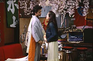 朝靄の中、「娘道成寺」の艶やかな衣装をまとった詩織(牧瀬里穂)が高層ビルの屋上から身を躍らせる。