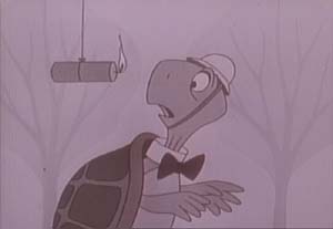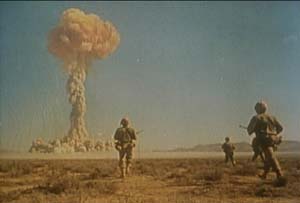 身を守る手段としてはサングラスひとつ、放射能測定バッジを胸に実験動物よろしく原爆実験場に放り込まれる米国兵たち。彼らに向かって将校が言う「これは単なる実験だ、君たちに危険はない・・・・・・。」あるいは可愛いらしい亀のバート君の登場するアニメーション。いつも用心深いバート君が子供たちに話しかける「さあ、もしピカッと閃光が走ったらどうする?そう、首を引っ込めて、もぐるんだ。」地震訓練さながら一斉に机の下にもぐり込む小学生たち。