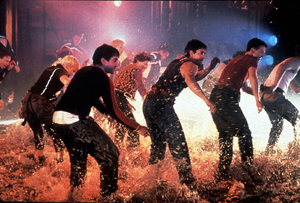 タップの映画といえば、フレッド・アステアの数々の名作や、ジーン・ケリーの「雨に唄えば」(52)、グレゴリー・ハインズの「ホワイトナイツ/白夜」(85)などが思い出されるが、「タップ・ドッグス」はそのどれにも当てはまらない。シルクハットに燕尾服というイメージを打ち破る、ジーンズにTシャツ、ワークブーツというラフなファッション。エレキ・ギターが奏でるロックや、ラテン、アジアの音楽を取り込んだパワフルなオリジナル・サウンド。そして建築現場、金網の上、トイレのふた、水の中…など、ありとあらゆる物を床にかえて踊るアクロバティックなタップ。そして人間業をこえたタップビートのスピード感。まさに新世紀を先取りした独創性とエネルギッシュな若さとパッションの爆発は、スクリーンをこえて観る者を興奮の世界にいざなう。